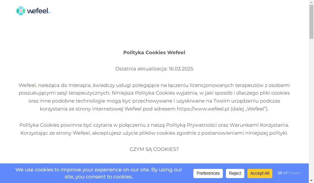 WeFeel to przestrzeń dla tych, którzy chcą pracować nad sobą, gdzie terapia online odbywa się w wygodnej formule zdalnej. Specjaliści pracują w ujęciu krótkoterminowym, dostosowując spotkania do indywidualnego tempa i możliwości klienta.Platforma umożliwia kontakt z terapeutami różnych nurtów, co pozwala dopasować formę pracy do potrzeb